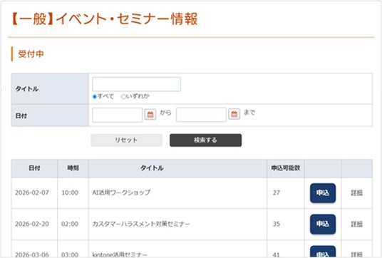 kintoneで管理しているイベント情報を、おりこうブログDXのWebページに公開し、申込フォームと連携することで、Web上での申込受付を実現します。
