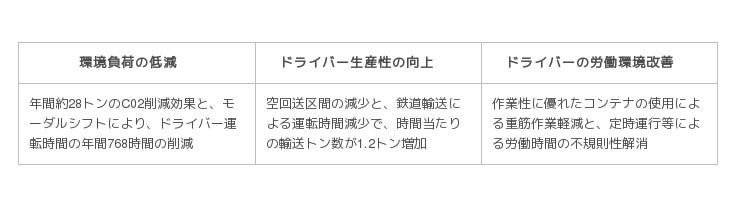 今回受賞対象となった取り組みは、31ft(フィート)のコンテナを活用した、調達物流と製品物流を組み合わせた新たなサプライチェーンの構築です。当社では、従来、関西から関東までの全国6ヵ所の主要拠点(工場、原料倉庫、商品倉庫)への輸送をトラックで行っており、「工場への原料納品」と「工場からの製品出荷」をそれぞれ実施していたため、復路を空車で走らせざるを得ない状況が発生していました。しかし、これらの全体最適化を図るため、今回、日本貨物鉄道と全国通運との協働により、31ftコンテナを活用した鉄道網で主力幹線ルートの一部を鉄道で結ぶ仕組みにシフトしました。また同時に、原料納品と製品出荷を往路・復路で一体化させ、空回送区間を削減することを実現致しました。これにより、大幅な「環境負荷低減」と「ドライバーの生産性向上」を実現しています。また、オートフロア※1やジョルダー※2を常備した31ftコンテナを活用することで、女性や高齢の方など体力に自信の無い方でも積卸し作業が苦労なくできるようになったほか、鉄道の定時性を軸としたスケジューリングにより物流特有の不規則性からも解放されたことで、「ドライバーの労働環境改善」にも寄与しています。