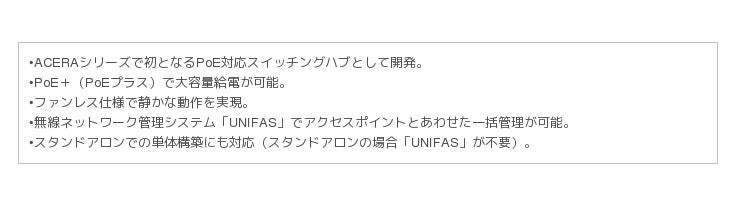 無線ネットワーク管理システム「UNIFAS」によるアクセスポイントとの一括管理を実現。8ポートと24ポートの2機種をラインアップ。