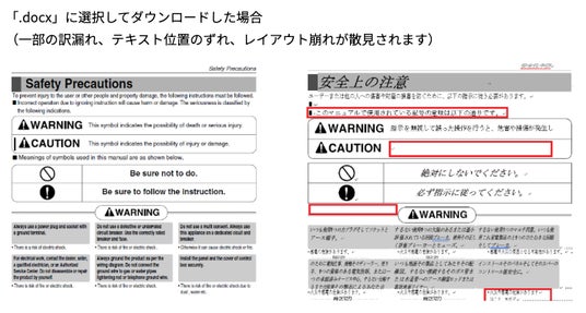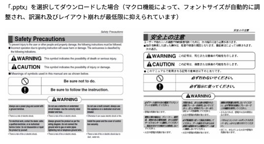 これまではWordファイルのレイアウトと異なるPDFファイルを翻訳した際に、レイアウト崩れなどが発生していましたが、PowerPointファイル形式での出力が可能になりました。