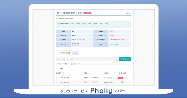 この新機能は、テストの作成から採点、提出状況の確認に至るまでオンラインで管理することで、「テストのペーパレス化」を実現し、オンライン授業、対面授業、ハイブリッド授業にシームレスに対応することができるようになりました。また、Phollyの他の機能(講義・教材動画配信、グループワーク機能、レポート課題機能など)と合わせることで、学習管理がワンストップで可能になります。学校職員および教員の方の負担軽減によりテストを日々の学習に取り入れやすくし、学習履歴をストックする「eポートフォリオ化」を促進し、生徒/学生の学びの振り返りにも役立てられます。