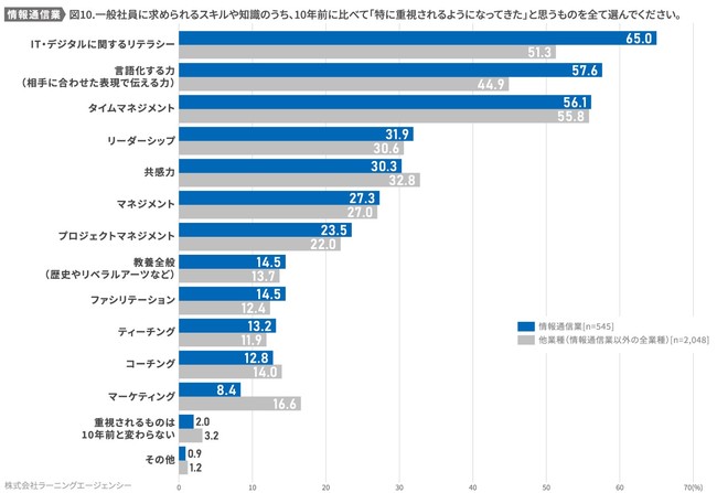 一般社員に求められるスキルや知識のうち10年前と比べて特に重視されるようになってきたものでは「IT・デジタルに関するリテラシー(65.0%)」が最多となり、「言語化する力(相手に合わせた表現で伝える力)(57.6%)」が第2位、「タイムマネジメント(56.1%)」が第3位に。ITが様々な業務で活用されるようになったことで、今まで接してこなかった例えば営業部門などの人と接する必要性が増え、誰にでも分かりやすく伝える力がますます必要になってきていると推察されます。