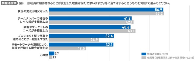 他業種(情報通信業を除く全業種)と比較してみると、「非定型的な業務・プロジェクト型の業務で役割を遂行する」では、他業種では50.5pt増のところ、情報通信業では55.5pt増となりました。また、「自ら現場で判断し、行動する」においては、全体で39.4pt増のところ情報通信業では45.5pt増となりました。これより、情報通信業では、DXの推進などのような、顧客もプロジェクトマネージャーも正解を持っていない案件において、状況を見ながら自ら判断し、役割を遂行することがより強く求められている、といえるのではないでしょうか。