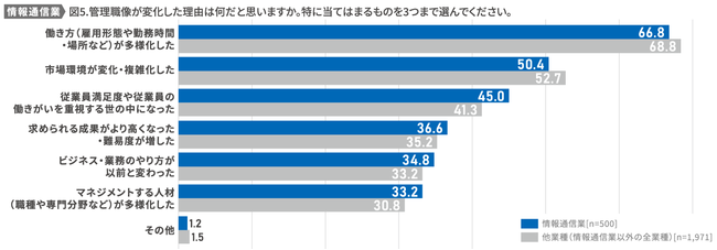情報通信業の管理職像が変化した理由を3つまで選んでもらったところ、「働き方(雇用形態や勤務時間・場所など)が多様化した(66.8%)」が最も多く、「市場環境が変化・複雑化した(50.4%)」が第2位となりました。「従業員満足度や従業員の働きがいを重視する世の中になった(45.0%)」も多く選ばれています。顧客の要望に合わせて、常駐先でシステムを納期内に開発することを最優先する働き方から、働き方の柔軟性や社員の満足度を高める方針に重心が移ってきていることがうかがえます(図5)。