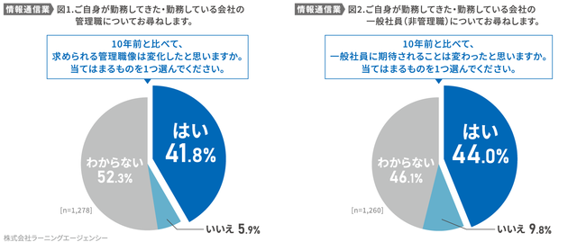 まず、10年前と現在を比較したときに情報通信業の管理職や一般社員に求められることは変わったのかを尋ねました。管理職に求められることが変わったと回答したビジネスパーソンは41.8%、一般社員に求められることが変わったと回答したビジネスパーソンは44.0%で、いずれも約4割となっています。