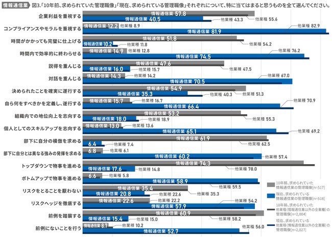 全体として、情報通信業の管理職は、10年前よりも例えば過度な残業をさせないなど、コンプライアンスやモラルを重視し、部下と対話して効率的に仕事を進められるよう管理、調整する役割を求められているといえます。