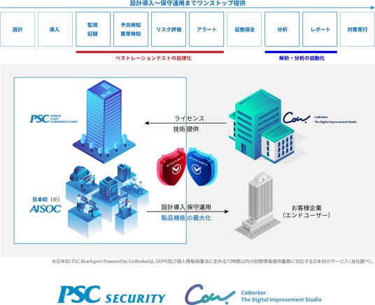 今回の協業により誕生する「PSC AI SOC」は、ペネトレーションテストの自律化「PSC RedAgent Powered by CoWorker」とフォレンジック分析自動化「PSC BlueAgent Powered by CoWorker」など「導入前のアセスメントや設計から保守運用まで一気通貫で提供」。SOCサービスに於ける予兆検知と解析‧分析の飛躍的に拡張、そして強化いたします。さらには、ペネトレーションテストの自律化など脅威検知能力も拡張。