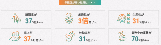ウェルビーイングとは、肉体的、精神的、社会的に満たされた状態(持続的な幸福状態)のことを指し、人的資本の情報開示でも注目されている概念です。この幸福度が高い社員は、低い社員に比べて、生産性が高く、離職率が低いということが分かっています。