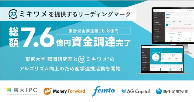 Personality Techを通じたHR事業「ミキワメ」を提供する株式会社リーディングマーク(本社:東京都港区、代表取締役社長:飯田 悠司)は、マネーフォワード、フェムトパートナーズ、AGキャピタル、新生企業投資の4社に加え、新たに東京大学の100%子会社である東京大学協創プラットフォーム開発(通称:東大IPC)への第三者割当増資を実行し、総額7.6億円にて本ラウンドをクローズしました(累計資金調達額16.8億円)。