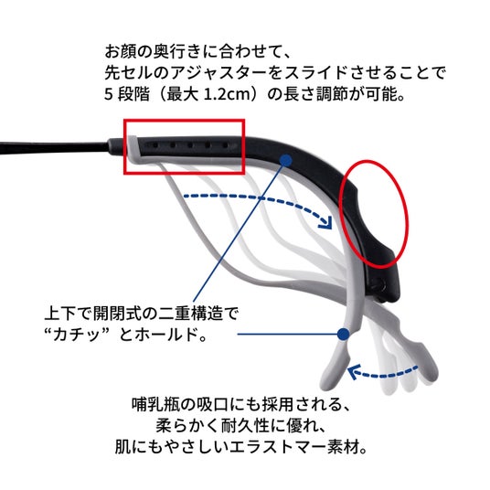 <4> 簡単に長さ調整可能、ツルが1.2センチ伸縮、顔の奥行きに合う究極のフィット感