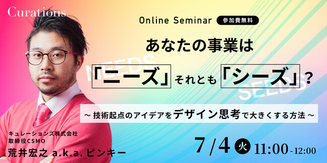 顧客企業のビジネス変革を成功に導くキュレーションズ株式会社(本社:東京都渋谷区、代表取締役社長:根本隆之、以下当社)は、『あなたの事業は「ニーズ」それとも「シーズ」?~技術起点のアイデアをデザイン思考で大きくする方法~』を2023年7月4日(火)に開催いたします。