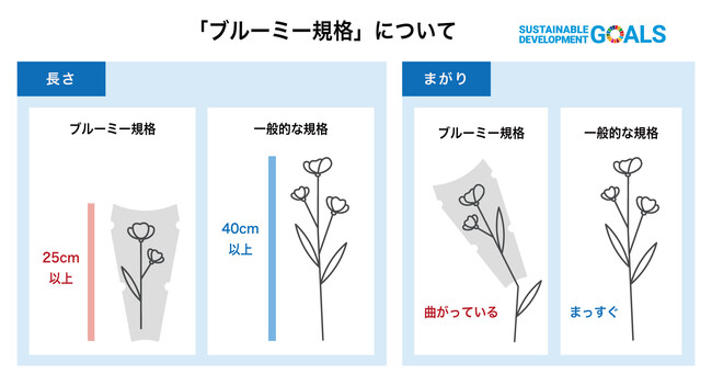 花には茎の長さなどの「規格」が存在し、品目や地域ごとに基準が定められています。品質が良好でも規格外と判断され、価値がつきにくくなるものがあります。サービス独自規格「ブルーミー規格」は、規格外の花も含め適性価格で独自に買い付けしているお花です。