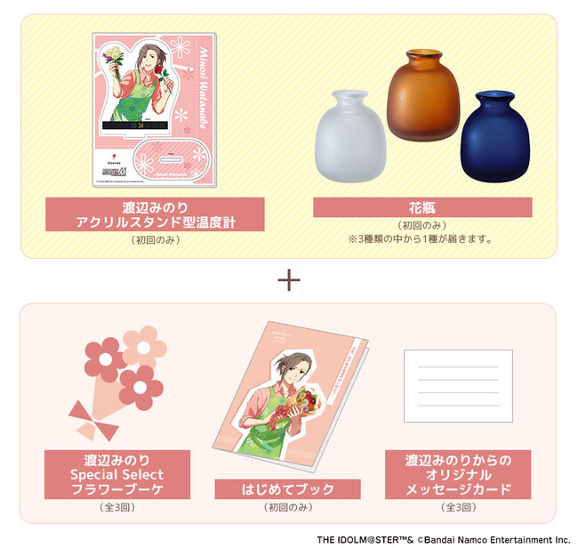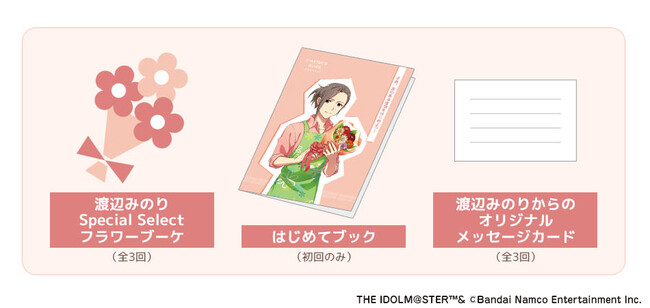 本コラボレーションは、「アイドルマスター SideM」に登場するアイドル・渡辺みのりがセレクトしたフラワーブーケと共に、彼からのオリジナルメッセージカードを添えて、全3回、毎月違うお花をお届けします。 また、お花のある生活を始める方へ向けての飾り方などを教えてくれる「はじめてブック」(コラボレーションオリジナル仕様)が初回のみ同梱されます。