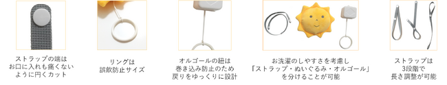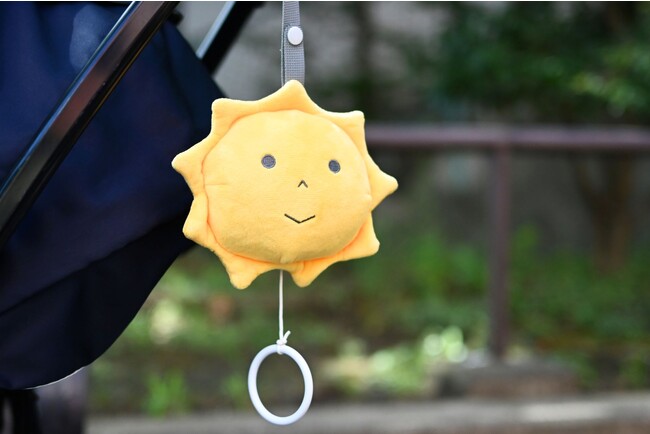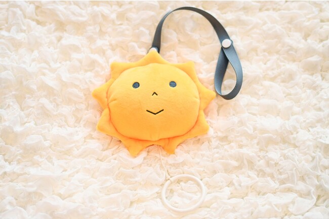「"小さな太陽シリーズ" いつもいっしょ」は、持ち運びに便利な手動式オルゴールの知育玩具です。リングを引っ張ると、優しいオルゴール音が流れます。ふわふわの優しい手触りが特徴で、サイズ感は赤ちゃんが抱えやすいことを考慮しました。また、赤ちゃんの肌に直接触れるため、厳しい成分検査もクリアしています。
