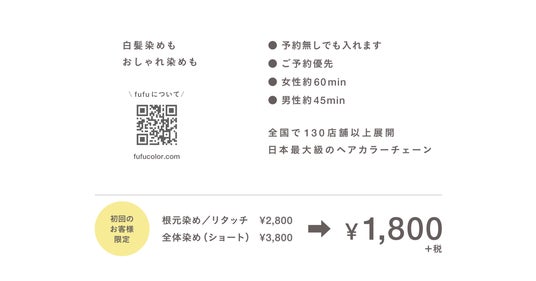 fufuを初めてご利用いただく方全員に、根元染め(リタッチ)税込3,080円&全体染め(ショート)税込4,180円を、税込1,980円でご提供いたします。