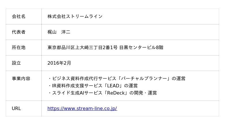 株式会社ストリームラインは「コミュニケーションの合理化で、ビジネスを進化させる」という理念を掲げ、2016年に資料作成代行サービス「バーチャルプランナー」、2021年にはIR資料に特化した作成支援サービス「LEAD」の提供をそれぞれスタートしました。