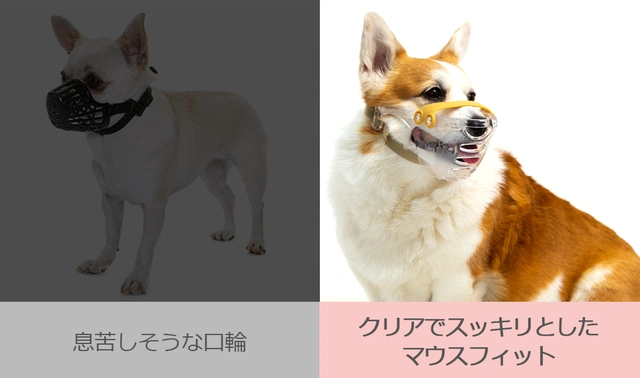 わんちゃん用の口輪に対する窮屈さや嫌悪感を感じさせない解放感のあるスタイリッシュな見た目。見た目にも実際にも苦しそうな口輪ではなく、クリアで快適、すっきりとしたデザインが特徴です。