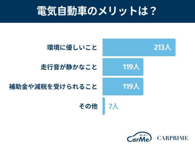 一方、「走行音が静かなこと」「補助金や減税を受けられること」をメリットと回答した人もそれぞれ119名となりました。