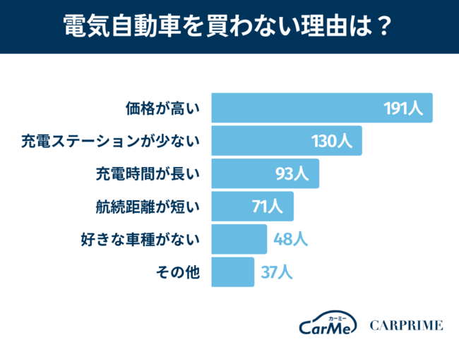 電気自動車を買わない理由として最多だったのは「価格が高い」で191名でした。次に来た理由は「充電ステーションが少ない」で130名という結果になりました。