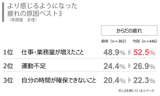 忙しさを感じる女性は7割を超え「からだの疲れ・負荷」を実感原因1位は「仕事・業務量が増えたこと」で昨年より17ポイント増の約6割