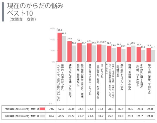 からだの悩みは、 「精神的・肉体的なつかれ(イライラ、疲れが取れないなど)」が52.4で1位に。コロナ禍後の前回(2023年4月)と比較すると、6ポイント上昇しています。 また、「運動不足による体力/気力低下」が8ポイント上昇するなどほぼ全ての項目で上昇傾向にあリ、全体的に悩みが増えている結果となりました。