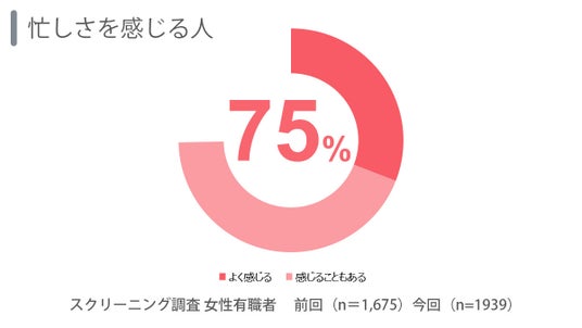 1)忙しさを感じる女性は75%。昨年同様に7割を超える高い数値に