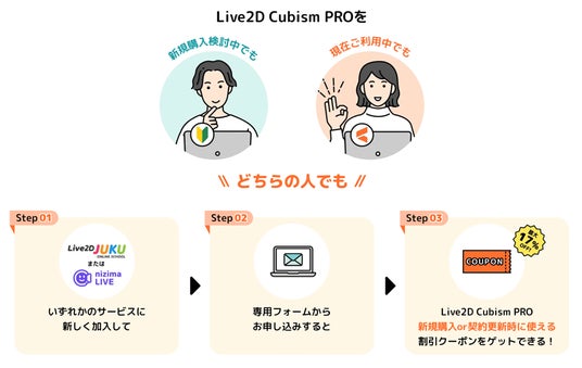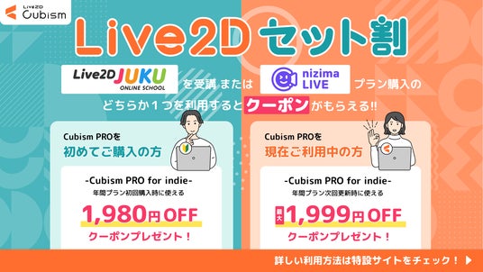 Live2D社が提供するオンライン講座「Live2D JUKU」、フェイストラッキングアプリ「nizima LIVE」のどちらかにご加入いただくと、Live2D Cubism PRO for indie 年間プランの新規購入または契約更新料割引クーポンが使用できます!