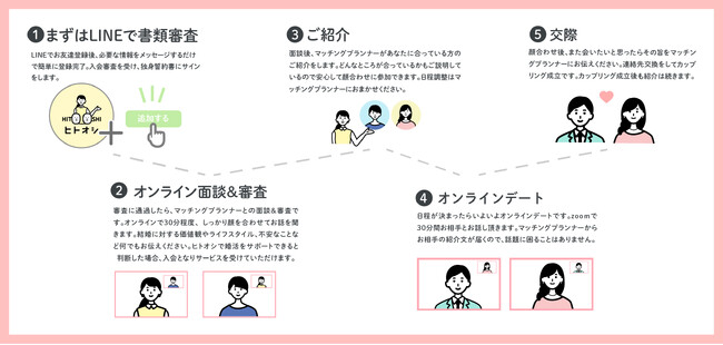 専属のマッチングプランナーが面談を元に人となりや価値観を理解し、ぴったりの異性との初デートをセッティング。面談から初デートまで、全てオンライン完結。面談・初デートはオンライン上で録画され、録画動画を確認した上で男女の組み合わせを提案するため、マッチング率は50%と業界平均の3倍以上。