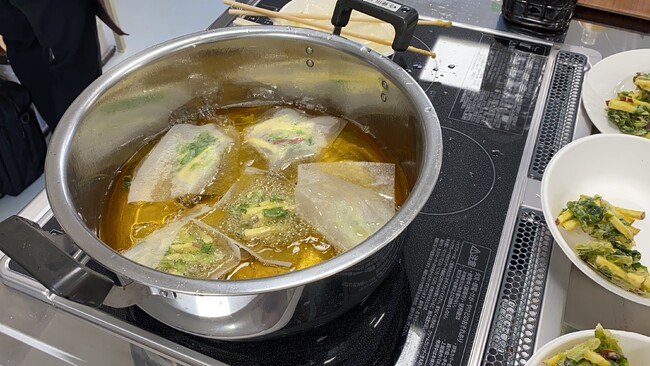 今回は「とまとドレッシング」「サツマイモと小松菜のかきあげ」の2種類を実施いたしました。参加者からは、「こめ油の魅力・おいしさだけでなく料理のコツを知ることができた」「斬新なメニューでこめ油の使用感が変わった」といった声が上がりました。