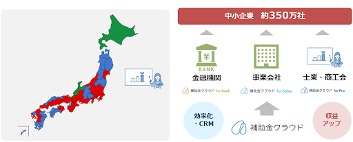「補助金クラウド」とは、補助金を必要とする地方の中小企業をターゲットに補助金申請をサポートするサービスです。主に、融資提供のニーズがある地域金融機関、事業会社、士業・商工会にサービスの導入を促し、間接的に中小企業の補助金申請をサポートしております。