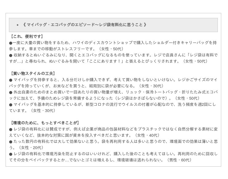 最後に、マイバッグに関するエピソードやレジ袋有料化に関する意見を聞きました。マイバッグを何種類も使い分けたり、収納するとぬいぐるみになるユニークなものを使っていたり…それぞれの買い物シーンが目に浮かびます。新型コロナの感染リスクが心配で洗濯回数を増やした人もいました。有料化に賛成しつつ、環境のためには“リサイクル回収に応じたペイバック”など、別の対策をすべきとの意見も。バッグだけでなく、品物の買い方や選び方など、毎日の買い物スタイルにも変化が必要かもしれません。