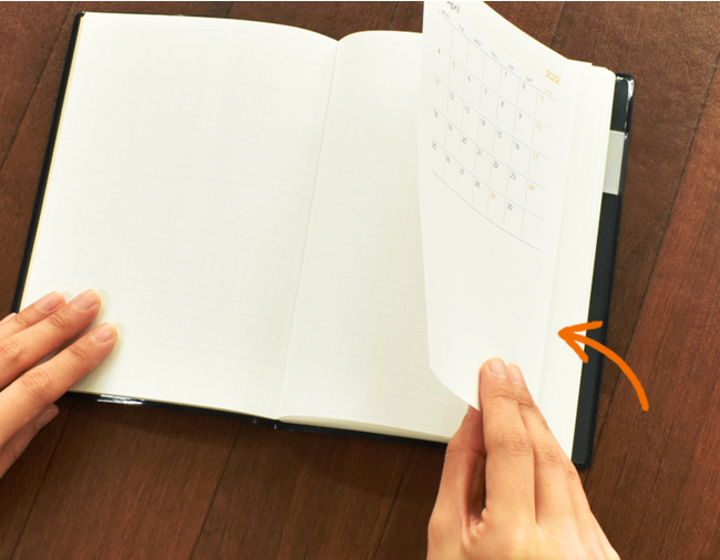 折り畳み式の月間カレンダー裏面は1か月の振り返りを記入できる方眼メモページです。記入した部分が隠れる仕様のため、人に見られたくない内容も安心して記入できます。