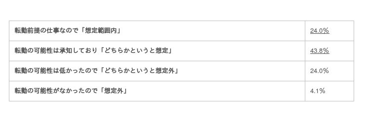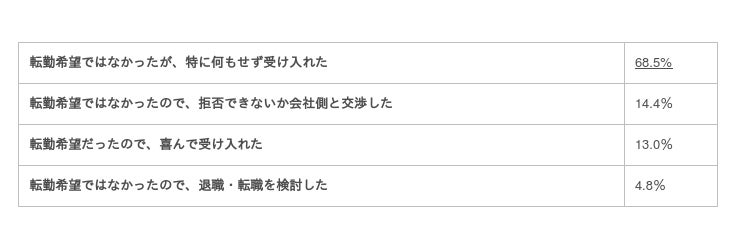 「転勤を希望していた」という人は13.0%と少数派で、87.0%の大多数が「転勤は希望していなかった」という結果でした。ただ転勤は希望していなくても、「会社と交渉」「退職・転職」など具体的なアクションを取った人は19.2%と少なく、「特に何もせず、何も言わず」に転勤を受け入れた人が約7割を占めています。