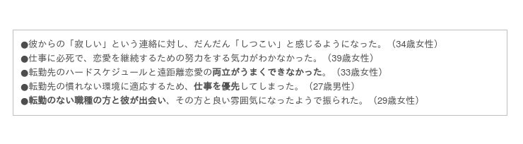 その他の理由は、▽自分が遠距離恋愛をしたくなかった(20.0%)▽恋人が遠距離恋愛をしたくなかった(15.0%)▽恋人に転勤先について行けない事情があった(15.0%)▽自分も恋人も遠距離恋愛をしたくなかった(5.0%)-などとなっていました。
