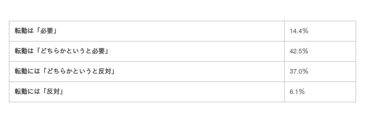 意外なことに、「転勤は必要」「どちらかというと必要」と考える人(56.9%)が、「転勤制度に反対」「どちらかというと反対」(43.1%)を上回る結果になりました。