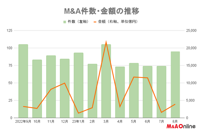 2023年8月のM&A件数(適時開示ベース)は前年を22件上回る95件と、3月(105件)に次ぐ今年2番目の高水準でした。前年比プラスは6カ月連続で、国内、海外案件がいずれも好調を維持しました。1~8月累計は670件と前年を82件、率にして14%上回るハイペースで推移しています。