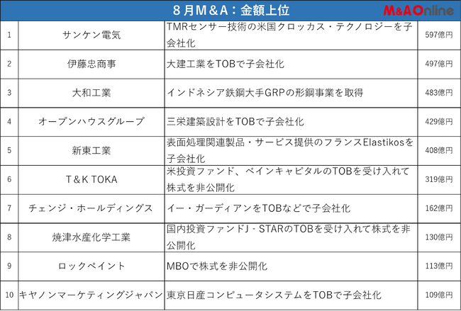 一方、8月の取引金額(公表分を集計)は3903億円。7月に続いて1000億円を超える大型案件がなく、件数の割に金額は伸びませんでしたが、サンケン電気が約600億円で米国企業を買収するのを筆頭に、100億円以上の案件数は11件と今年初の2ケタを記録しました。