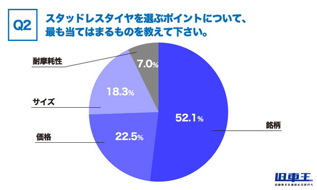 Q1でスタッドレスを履くと答えた方にスタッドレスタイヤを選ぶポイントについて聞いてみると、最も多かった回答が「銘柄」で52.1%でした。