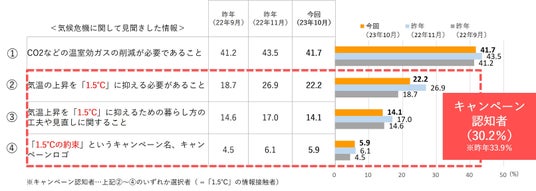 ・23年3月からのキャンペーン期間中(以下 期間中)に、「気温上昇を1.5℃に抑えるべき」という情報や本キャンペーンのロゴに触れたと回答した人は30.2%。昨年のキャンペーンから微減となった。(22年の認知率は33.9%)