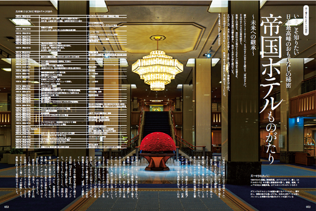 日本の迎賓館として日本のホテル文化をけん引してきた「帝国ホテル」。帝国ホテルのおもてなしを支えてきたレジェンドたちへのインタビューや、2036年の新本館誕生に向けてプロジェクトについて紹介。また今年は、近代建築の巨匠・フランク・ロイド・ライトが手掛けた2代目本館の100周年でもあり、ライトと帝国ホテルについての記事も収録しています。多くのホテルが誕生しているいまだからこそ知っておきたい、メイド・イン・ジャパンのホテルだからこその魅力と可能性を紐解きます。