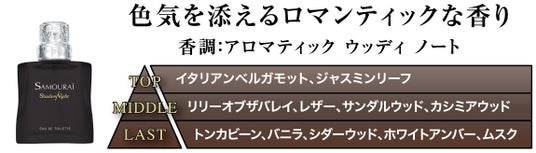 常に現代を生きる男性の装いを香りでリードしてきた「サムライ」が、月夜に落ちた影のような美しいフレグランスを創作しました。いつでも遊び心と探求心を忘れない活力と大人の落ち着きを備えた男性に色気を添える、ロマンティックな夜のひとときに相応しいフレグランスとなっています。