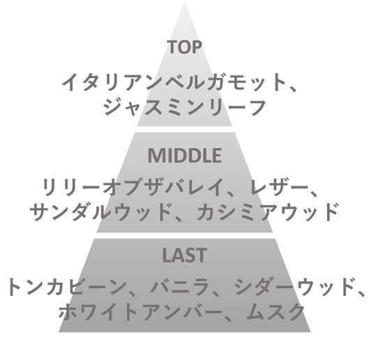 Scent ― 香調:アロマティック ウッディ ノートベルガモットとグリーンの香りが鮮烈なトップノート。続くミドルノートではリリーオブザバレイやレザー、ウッディなどの落ち着いた 香りが上品で力強い印象を作ります。ラストノートにはまろやかな甘さのトンカビーンとバニラにシダーウッドのスパイシーさ、アンバーやムスクのすっきりした甘さが重なり、しっかりとしたボディでありながら行き過ぎないバランスを保った香りとなっています。