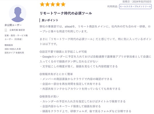 ITreview に投稿いただいたユーザーレビューの一部をご紹介します。「リモート商談をメインに、社内外の打ち合わせ・研修、ロープレと様々な用途で利用しています」との高評価をいただいております。