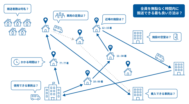 この搬送計画は、一人ひとりの患者情報をもとに、宿泊療養施設の空室状況や搬送車ごとの定員、患者の自宅等を巡回する経路・所要時間、搬送可能時間など、さまざまな条件を勘案して、市の職員によって作成されています。福岡市は、感染拡大によって搬送対象の患者が1日あたり100名、200名規模と増加した場合に備え、すぐに利用開始できるクラウドサービスの活用を前提に、搬送計画の作成に関する業務のシステム化を検討しました。
