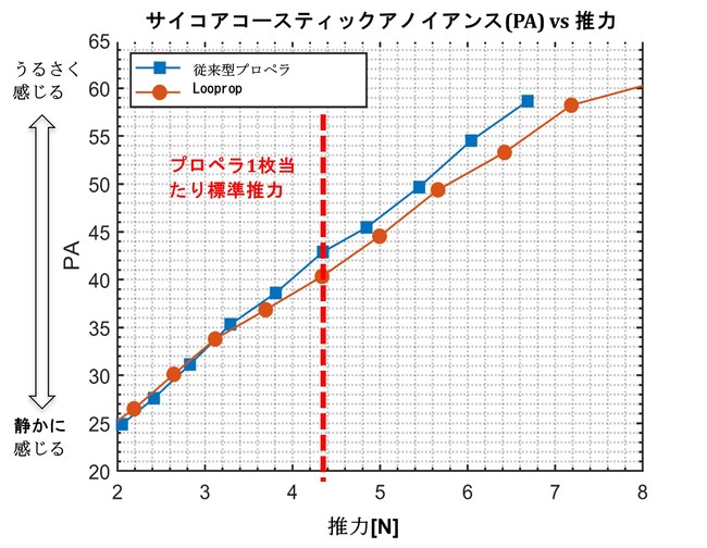 JAXAとACSLはレベル4社会の「音」の課題を解決するべく、LoopropをSOTEN向けに最適化設計した「Looprop for SOTEN」の試作品を共同開発しました。最適化設計により、従来型プロペラ(現在のSOTENのプロペラと同形状)との比較において、同等の推力を維持したまま静音性能を達成し、人の不快感が軽減されたことを確認しました。(図3)