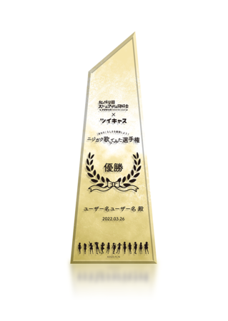 「ニジガク歌ってみた選手権」は、ツイキャスでは初の公式「歌ってみた選手権」となります。本選手権では、「TOKIMEKI Runners」や「虹色Passions!」などの虹ヶ咲学園スクールアイドル同好会の楽曲を課題曲(全14曲)として使用。課題曲を通して、より「あなた」らしさを表現してください。リスナー投票により優勝者が決定する、配信者・リスナー全員参加型の選手権となっています。優勝者には、ロゴと優勝者の名前入り特製トロフィーを贈呈いたします。