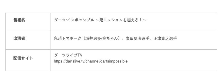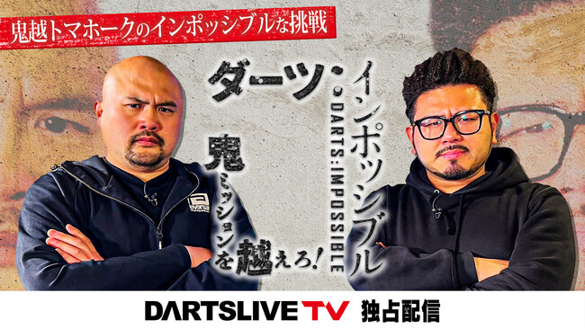 番組は、ダーツ未経験者である鬼越トマホークの2人が「初心者の達成率は0.1%」だというハットトリック(※1)を目指し、クリアするまで帰れないという“鬼”ミッション企画。ダーツライブ公式動画配信サービス「ダーツライブTV」での独占配信となり、アカウント作成で、すぐにお楽しみいただけます。(※2)