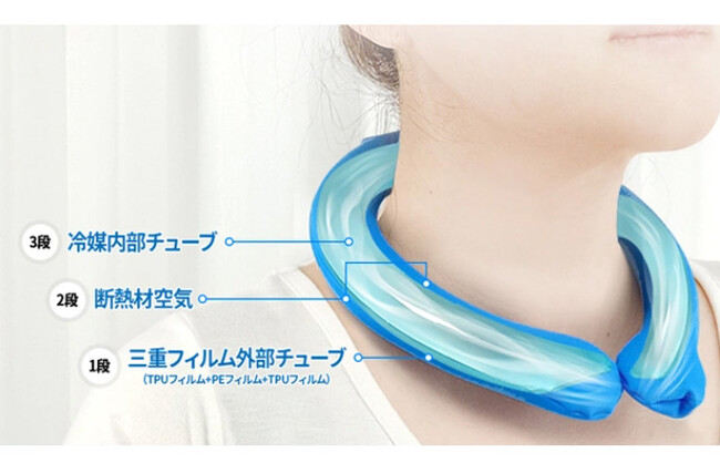 18度で凍りはじめるPCM素材を空気の層で覆い、冷たさを長くキープできる「2層ネッククーラーAIR」です。
