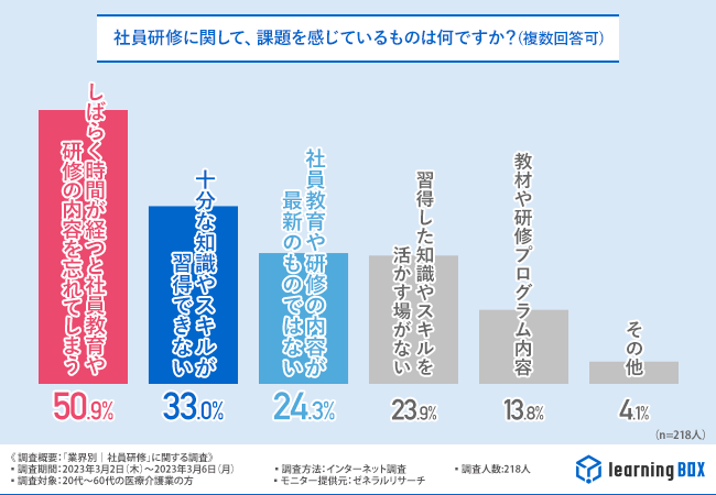 医療介護の現場で行われている社員研修には、時間が経つと社員教育や研修内容を忘れてしまうなどの課題感があることが分かった。