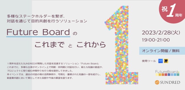 100個の新産業の共創を目指す「新産業のエコシステムビルダー」SUNDRED株式会社(所在地:東京都渋谷区、代表取締役:留目 真伸、以下:SUNDRED)は、対話による知識創造・蓄積・共有・発展を促すソリューション「Future Board」(フューチャーボード)を提供しています。この「Future Board」の提供開始1周年を記念して2月28日(火)に1周年記念イベント「多様なステークホルダーを繋ぎ、目的共創を行う新たな対話のソリューション-Future Boardのこれまでとこれから」をオンラインにて開催します。